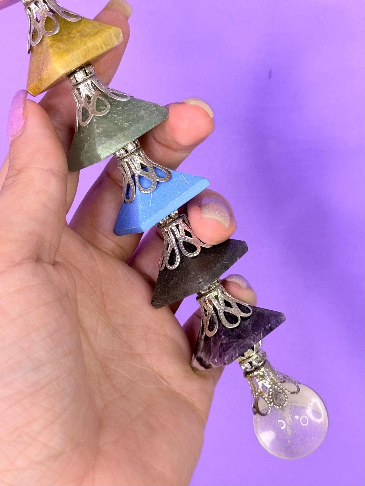 Esta impresionante varita es una herramienta esencial para la sanación energética, la meditación y el equilibrio de tus centros energéticos. Cada pieza ha sido cuidadosamente seleccionada para resonar con un chakra específico, mientras que el cuarzo cristal amplifica y enfoca la energía.