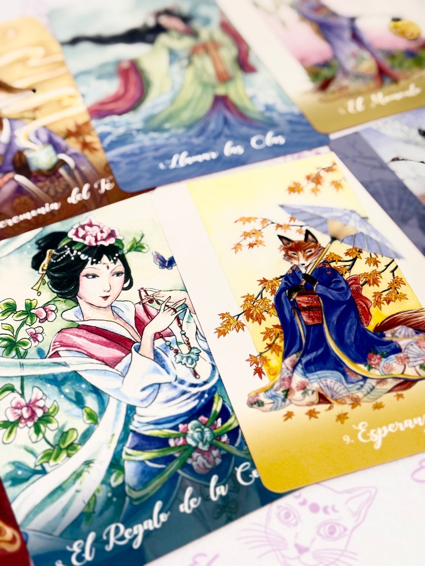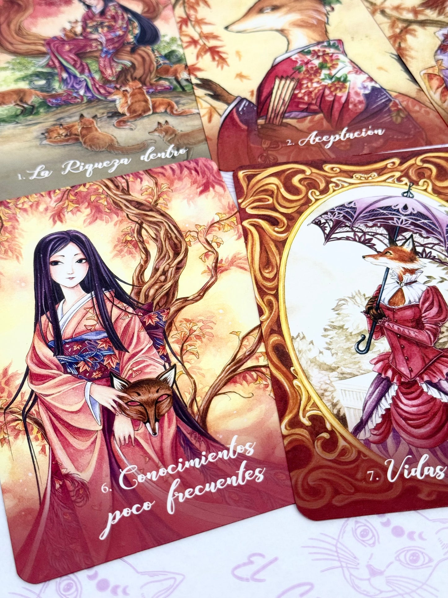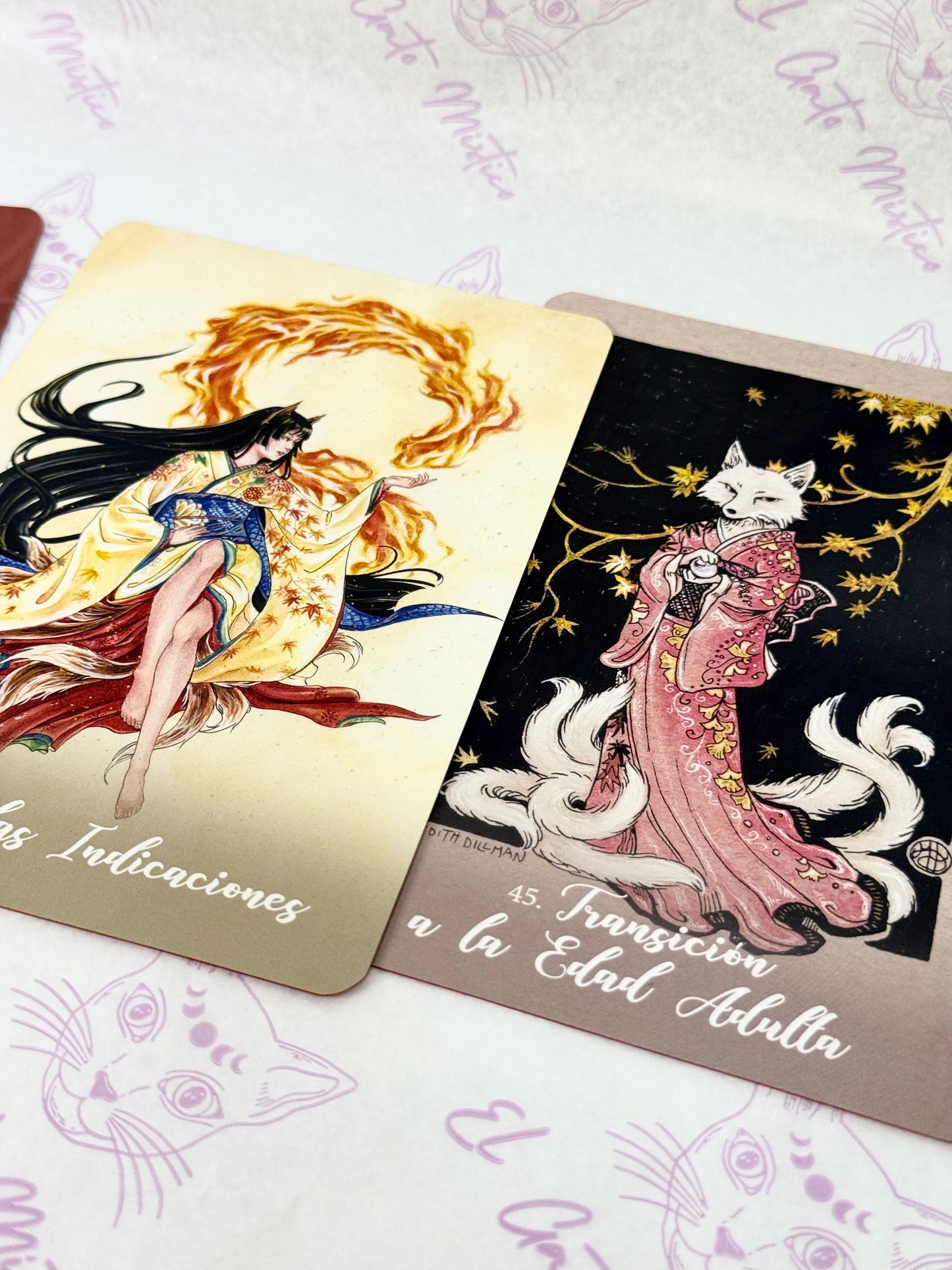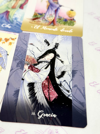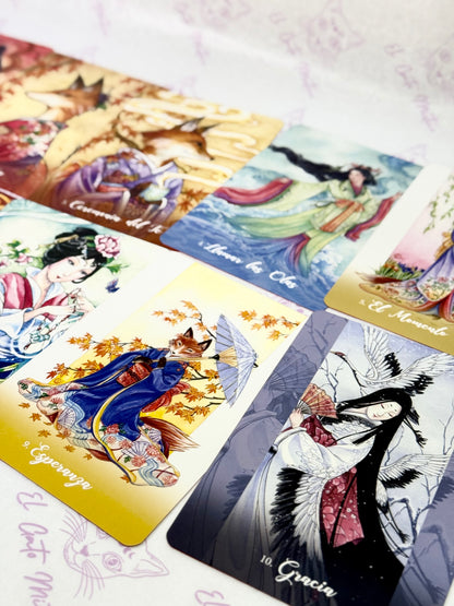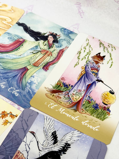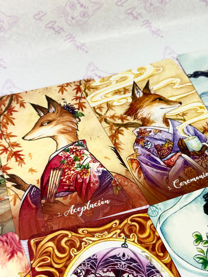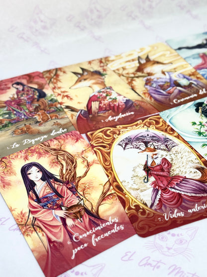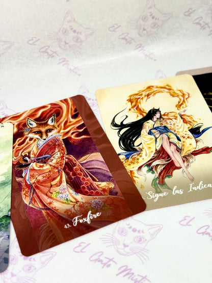 Con orígenes en la antigua espiritualidad oriental, los Kitsune son zorros metamórfi cos legendarios que trabajan con la deidad sintoísta Inari. Leales, sabios y muy inteligentes, los Kitsune traen suerte y abundancia, y dan consejos apropiados y sagaces para todo lo relacionado con la mente, el cuerpo y el alma. Prácticos y místicos, los Kitsune tejerán sobre ti energías fuertes y protectoras y te concederán sus numerosos regalos y bendiciones.